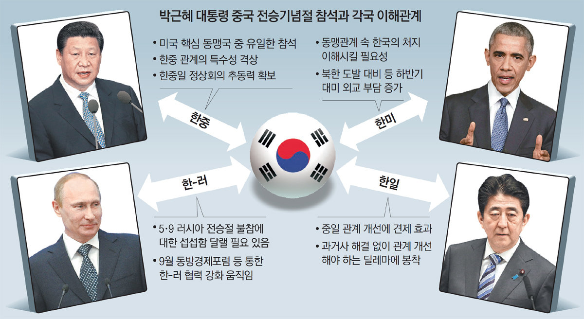 물론 그렇다고해서 한국이 중국에 대해 목소리를 내는데 꼭 소극적이기만 할것이냐면 그렇진 않다. 아니 오히려 반중감정은 나날이 높아지고 있다. 박근혜의 전승절 외교가 중국이 북한의 핵무장을 용인하는 방항으로 결말이 났고, 미세먼지 팽창정책 문화충돌 등 마찰도 많다. 한국의 반중외교는 일본 호주는 물론 대만보다도 리스크가 크다. 한강의 기적이 독재체제 하에서 벌어졌던 지라 중국이나 북한 체제를 상대적으로 좋게 평가할 여지가 있긴하다. 하지만 어디까지나 '지도자가 유능할 때'에 한해서지 무능한 인간이라면 얄짤없다. 그리고 미국에 대한 호감도가 낮지도 않다.