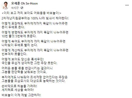 하지만 재난지원금 보편지급주장을 두고 고고하게 '어화둥둥 바보놀이' 소리하던 사람이 재산세 감면을 이야기하고, 소득없는 1가구 1주택자는 아예 재산세를 면제해주겠다고 한다. 시간차가 몇 년 나는 것도 아니다. 2차 재난지원금 때였으니 불과 6개월 전 이야기다.