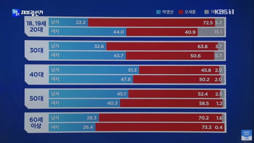 한편 20대 30대 남성들은 대놓고 민주당의 성차별 정책때문에 오세훈 후보한테 표 줬다고 이야기하고 있다. 그러나 이 문제에 대한 민주당 차원의 언급은 거의 없다. 하지만 윗물에서 그러거나 말거나 아랫쪽에선 남성차별하는 한국식 페미니즘을 싫어하는 사람들이 많았다. 20대를 징병하고 그 의무가 남성에게만 부과되는 상황에서 군인을 비하하고, 병역의무가 열악한 현실에서 여성피해의식을 내세워 여성우선정책을 했으니 당연한 현상이다.